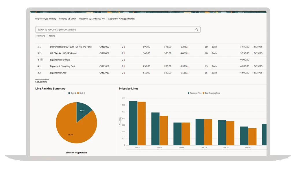 Com a funcionalidade de Fornecimento do Oracle Procurement Cloud, sua equipe identifica as melhores oportunidades para redução de custos e consolidação de gastos. Utilize a IA para encontrar os fornecedores ideais e conduza negociações de forma mais rápida e inteligente, garantindo o melhor valor para o seu negócio.