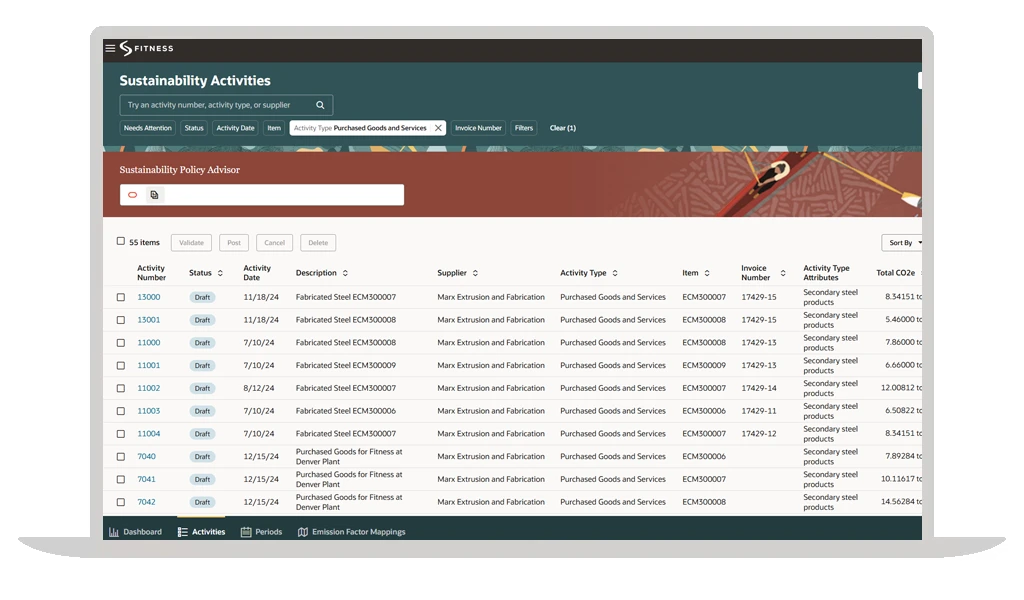 Com a funcionalidade de Rastreamento do Impacto Ambiental, sua empresa pode monitorar e relatar as emissões de gases de efeito estufa diretamente na plataforma. Colete dados de fornecedores, faturas e itens para atender aos requisitos regulatórios e promover práticas de aquisição mais sustentáveis.